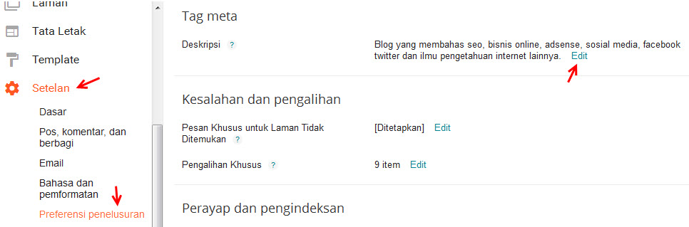 Oh yes in setting their own blogspot, actually there are two settings of the first search description search description in the Settings> Basic | in the description section, while the second is the setting description in the Search Preferences menu | The Meta Tags section - description, both can fill, but the descriptions are different.The description contained in the Menu Settings> Basic it is the description for the blog title, so the description will appear below the title of your blog, if you bring up the template header, while the description contained in the Search Preferences Menu |at the Meta Description - The description of it is for the meta description that will fill every article posts you make.